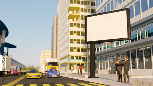 three-dimensional, advertisement, billboard, horizontal, advertising, blank, downtown, information, announcement, marketing, signs, render, signpost, frame, media, panel, promotion, signboard, business, empty, illustration, modern, outside, public, racked, banner, poster, template, urban, design, background, city, building, street, pole, daylight, shadow