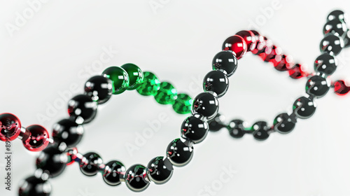 3D model of a DNA double helix made from black and red pearls on a white background