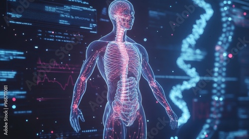 3D model of the human body with digital anatomy and DNA biotechnology, highlighting health innovation and scientific advancement.