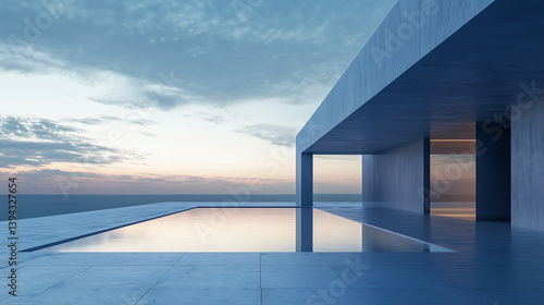 3D Modern seaside house with a pool, reflecting minimalist luxury at sunset.