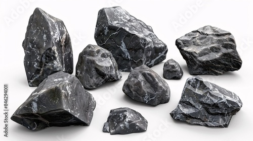 3D mountain formations: lifelike dark rocks of varying dimensions. Textured geological stones with authentic features, perfect for design elements on a white backdrop.