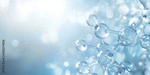 3D Organic Molecules on Blue Background, Collagen Skin Serum with Vitamin Pink Bubbles in Water for Beauty Care