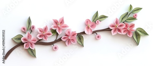 3D paper-cut of pink cherry blossoms and green leaves with branch