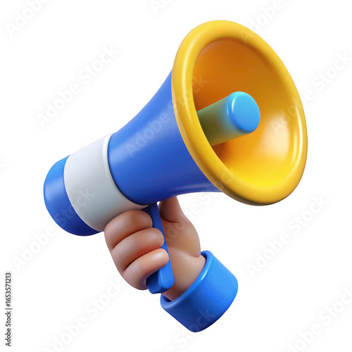 three-dimensional, megaphone, bullhorn, announcement, communication, hand, holding, blue, yellow, realistic, render, isolated, on, transparent, background, object, graphic, illustration, promotion, warning, sound, speaker, alert, vintage, retro, tool, device, advertising, marketing, broadcast