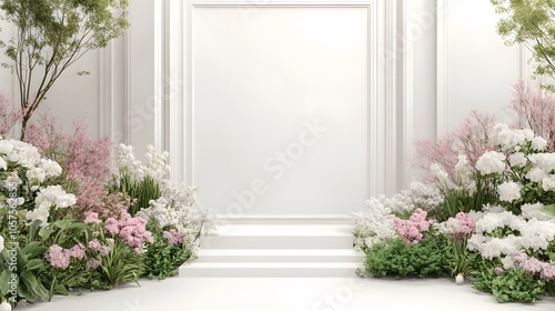 3d realistic white display on flower garden, white background