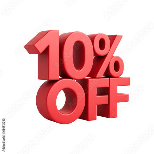 3D Red 10% OFF discount symbol isolated on a transparent white background, clipping path