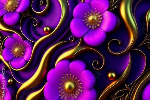 3d render, abstract background with purple and gold flowers and leaves, floral botanical wallpaper created with Generative AI technology