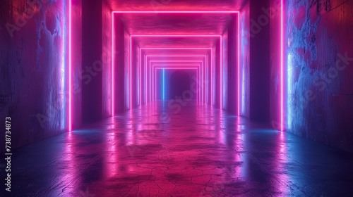 3d render, abstract panoramic red blue pink neon background with arrows showing right direction, glowing in the dark