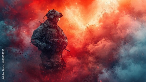 3d render brave strong and confident man soldier wearing army clothes, green camouflage stand holding gun, ready to shoot isolated in red concept background military