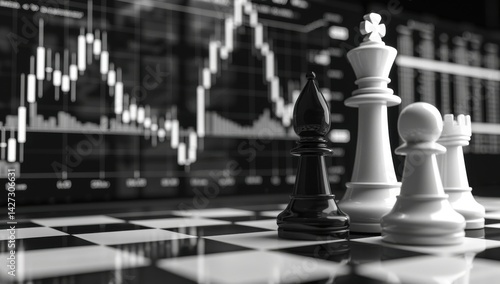 3D render of a chessboard with a black bishop, white king, and stock market charts as the background in black and white tones.
