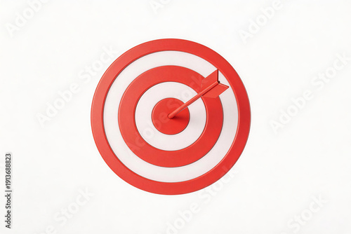 3D render of a red and white target with an arrow hitting the bullseye, symbolizing success, achievement, and precise aiming. Ideal for business, strategy, and goal-setting concepts.