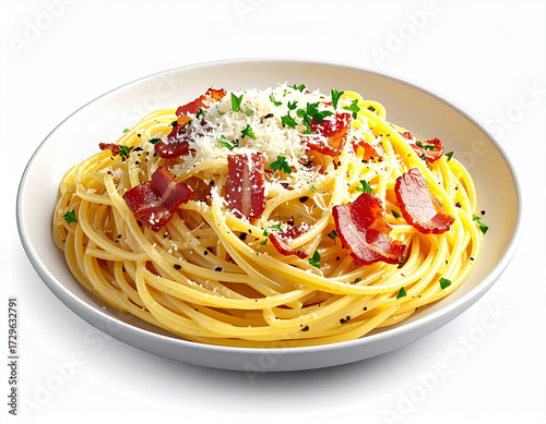 3D render of spaghetti carbonara with creamy sauce, bacon slices, and parmesan, isolated on white background