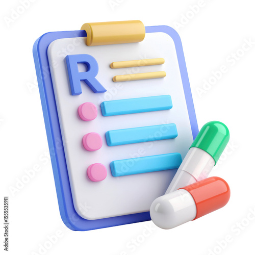3D render prescription document with pills illustration representing medical prescription and pharmaceutical treatment concept, isolated on white background