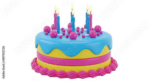 3D Rendered Birthday Cake with Blue and Yellow Frosting, Pink Spheres and Candles