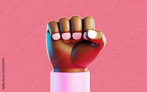 3D rendered black hand clenched in a fist, a symbol of unity and strength, raised against pink