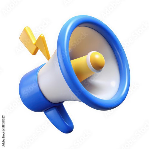 megaphone, bullhorn, announcement, communication, alert, sound, audio, broadcasting, public, address, warning, information, news, promotion, advertising, marketing, social, media, icon, symbol, graphic, illustration, three-dimensional, render, digital, art, cartoon, stylised, blue, white, yellow, lightning, bolt, energy, power