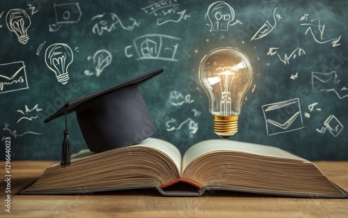 render, graduation, cap, light bulb, open, book, educational, symbol, blackboard, background, innovation, progress, excellence, project, study, success, classroom, idea, teacher, leadership, achievement, inspiration, development, sharpened, academic, cv, talent, potential, pedagogy, assessment, life events, method, resource, mentor, vision, wisdom, degree, concept, engagement, technology