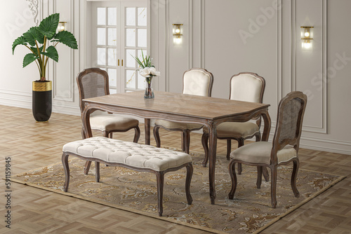 three-dimensional, apartment, background, carpet, chair, chandelier, classic, comfortable, contemporary, decor, decoration, design, dining room, dinning, empty, antechamber, front, frontal, furniture, green plant, hall, home, house, indoor, lamp, lifestyle, lounge, nobody, paint, parquet, pillow, plant, render, room, seat, sideboard, sofa, table, vase, wall