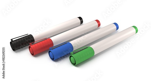 3D rendering - set of colorful whiteboard markers isolated on white background.