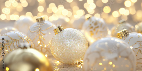 3d rendering, Christmas white and gold background with Christmas balls and decoration