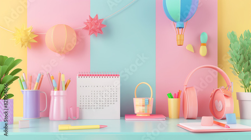 3d rendering concept colorful themes of back to school . educational background with copy space surround by kids merchandise catalog, calendar , pens, erasers, books , childlike, desk, School supply