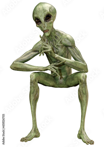 3D Rendering Green Alien on White