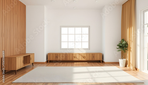 3D rendering minimal style living room with wooden floor ,white wall,wooden brown cabinet,big window,carpet isolated with white highlights, png