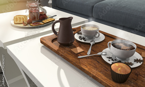 3d rendering nice coffee set and pastry for breakfast on the table with sun glare
