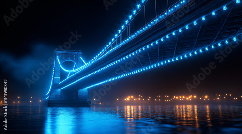 3D rendering of a bridge with blue lights over water on a black background, low-angle view.