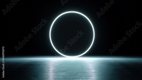 three-dimensional, rendering, circular, light, ring, middle, dark, room, white, line, form, shape, background, black, making, floor, concrete, reflecting, surface, water, mysterious, digital, digital artwork