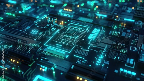 3D rendering of a digital circuit board with glowing blue and green elements, representing innovation and tech development.
