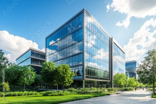 3D rendering of a modern office building with a glass facade and a green park nearby, under a blue sky on a sunny day.