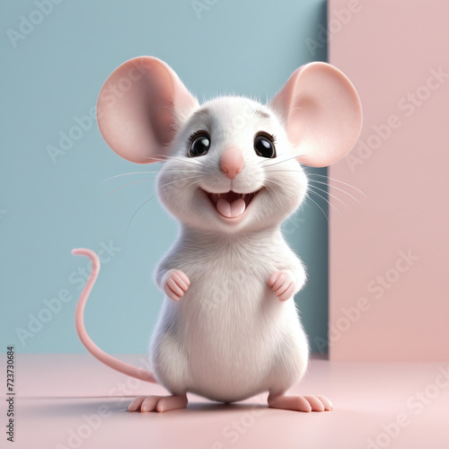 3D rendering of an adorable kawaii furry smiling standing mice or mouse looking very happy for joy. pastel color background.