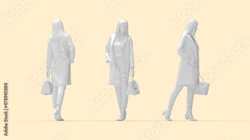 3D rendering of fashionable woman with a purse posing. Multiple views silhouette, side front and back.