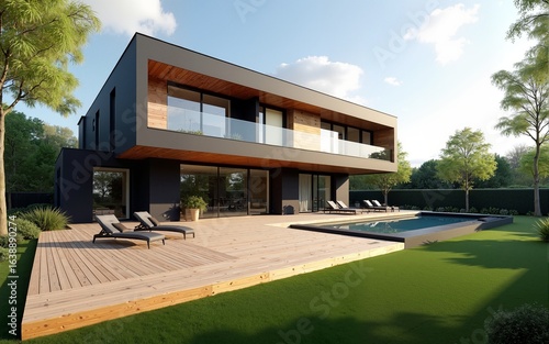 3d rendering of luxury modern house with large wood deck floor and lawn yard. High quality