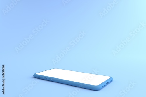 3D rendering of mockups blue Smartphone white screen on blue floor, Blue Mobile phone lay down on the ground. Smartphone white screen can be used for commercial advertising,Isolated on blue background