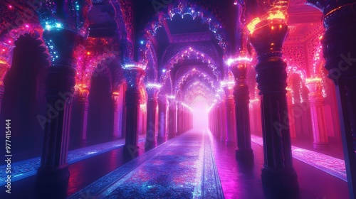3D rendering of psychedelic Indian patterns with glowing energy and ample copy space.