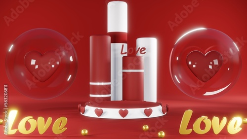 3D rendering of red podium for Valentine products on Valentine's Day.