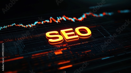 3D rendering of the word SEO glowing on a digital screen alongside a stock chart and graph, representing digital marketing strategies, online visibility, data analysis