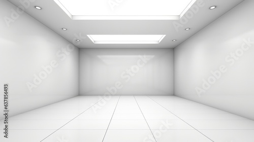 3d rendering of white empty space in room, Ceramic tile floor in perspective, window and ceiling strip light.