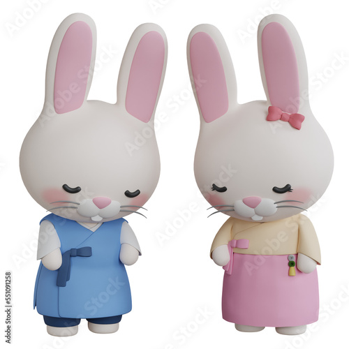 3D Rendering Rabbit Wearing Hanbok Greetings. PNG Transparent Background.