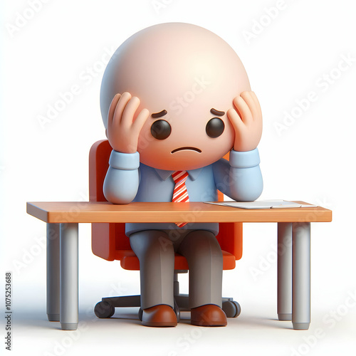 3D Sad Worker at Desk Concept, Individual Sitting with Head in Hands, Distressed and Sad on Blue Monday, Ideal for Magazine Ads, Copy Space, 3D Icon, Isolated on White Background