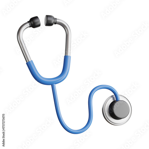 stethoscope, medicals, health care, doctor, nurse, hospital, clinic, diagnosis, check-up, instrument, tool, equipment, icon, three-dimensional, stylised, cartoon, blue, black, silver, white, diaphragm, tubing, ear, sound, listening, heartbeat, lung, patient, treatment, care, medicine, health, wellness, professional, anatomy, exam, graphic, illustration, design, concept, modern, vibrant, colourful, digital, object, accessory
