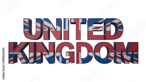 3D text 'UNITED KINGDOM' featuring the Union Jack flag design, against a solid transparent background, suitable for transparent overlay. background removed