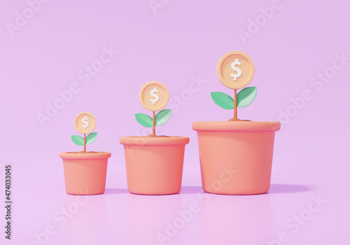 3D Three plant pot small to large with money tree coin dollar on purple background. Business profit investment concept, Finance education. cartoon minimal. 3d render illustration
