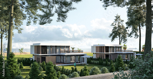 3D visualization of a modern apartment building by the sea. Modern architecture. House with terraces and balconies.