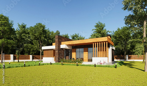 3D visualization of a modern villa with a large plot. Individual residential building. Modern architecture