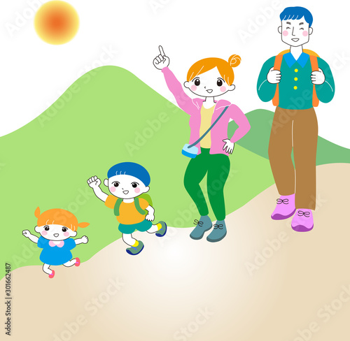 ハイキング 家族 4人セット 笑顔 表情 夫婦 子ども カラフル スタイリッシュ