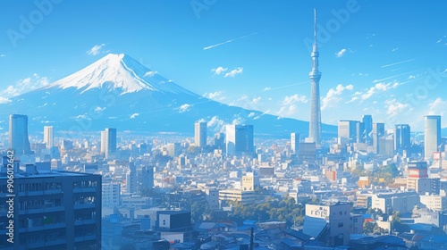 animation, animation, illustration, illustration, material, clean, landscape, lovely, pretty, art, artistic, view, nature, background, art, image, tour tourism, tourist attraction, healing, city, horizon, architecture, building, sky, downtown, skyscraper, city landscape, business, urban, office, tower, construction, panorama, travel, japan, tokyo, fuji, fuji, blue skies, city centre, symbol, volcano, mountain, cloud