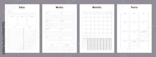 4 set of Yearly Monthly Weekly Today planner. Minimalist planner template set. Vector illustration.